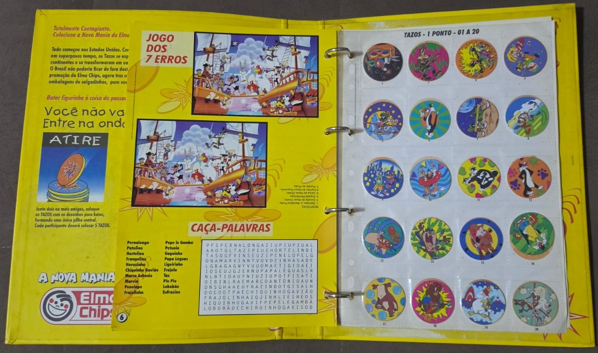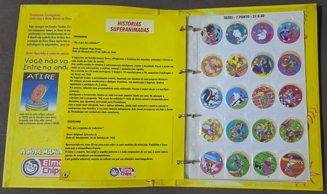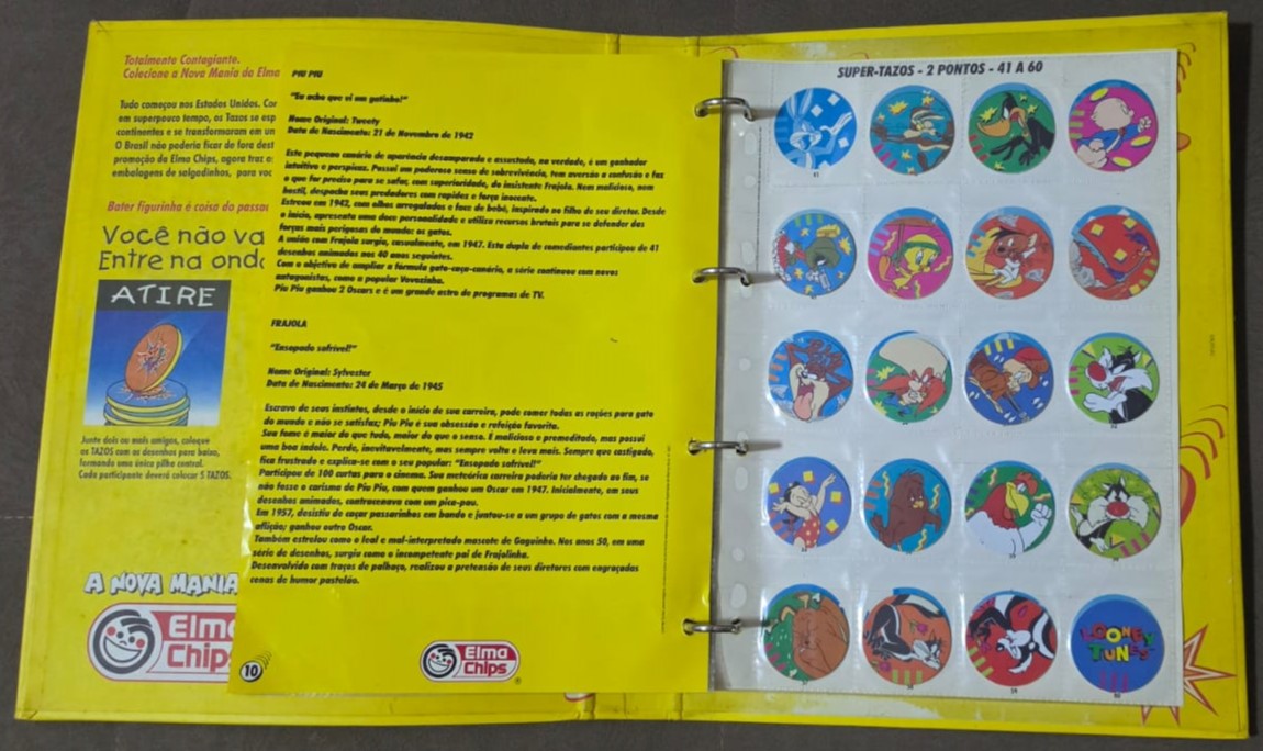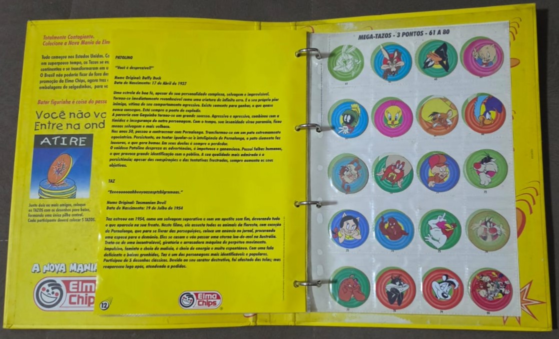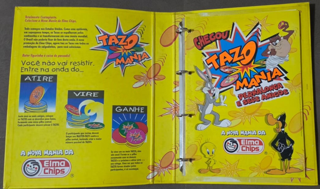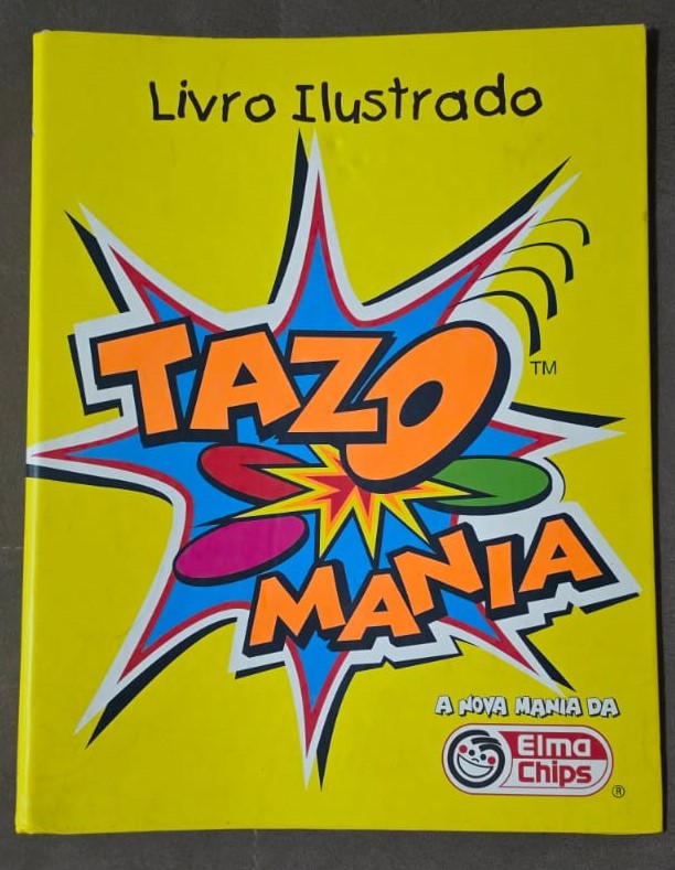 Livro Ilustrado Tazo Mania, um álbum/fichário lançado pela Elma Chips em 1997 para colecionar a primeira série de Tazos no Brasil. Esta coleção inicial foi baseada nos personagens de Looney Tunes, como Pernalonga e Patolino, e contava com 80 tazos diferentes divididos em categorias como normal, super e mega. YouTubeYouTube +3Sobre a Coleção Tazo ManiaLançamento: Os Tazos chegaram ao Brasil em março de 1997, tornando-se um fenômeno cultural imediato entre crianças e jovens.O Álbum: O “Livro Ilustrado” funcionava como um guia e organizador, possuindo espaços específicos ou plásticos para catalogar cada unidade encontrada nos pacotes de salgadinhos como Cheetos, Ruffles e Fandangos.FALTA n:41 E 61